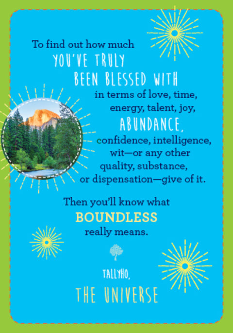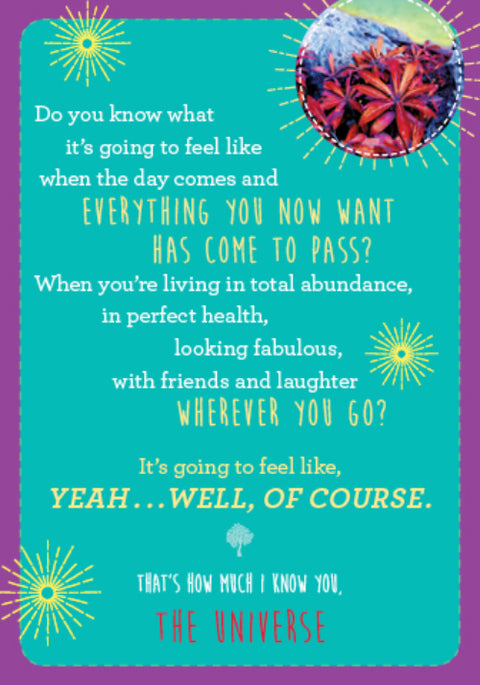 Šioje kaladėje esantys užrašai, išryškinti nuotraukomis, kuriose vaizduojama pačios nuostabios ir gausiai įvairios gamtos gausa, yra trumpos ištraukos, skirtos priminti, kad negalime būti labiau mylimi, galingesni ar labiau nusipelnę to, ko širdis trokšta. „Today, you are a magnet for infinite abundance, divine intelligence and unlimited love“, – sako Visata. „Actually, this has always been true“.