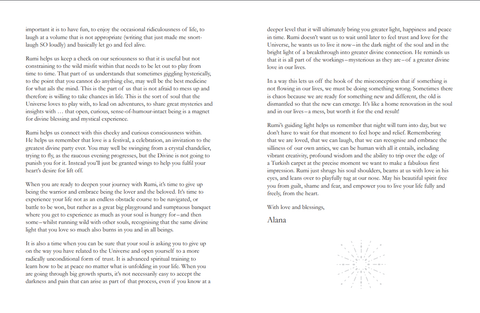 Šiame prabangiame iliustruotame žurnale pateikiami Rumi įkvėpti bestselerių autorės ir garsios dvasinės mokytojos Alanos Fairchild pamąstymai, taip pat Rumi citatos, kurias meistriškai išvertė Rassouli, kurio spalvoti meno kūriniai yra įsiterpę į visą pasaulį, įkvepiantys šią knygą gyvybingos energijos. Rumi padeda mums įveikti suvokiamas kliūtis, su kuriomis susiduriame, užmegzti didesnį dievišką ryšį. Kviečiame pagilinti savo kelionę su Rumi šio žurnalo puslapiuose, semdamiesi įkvėpimo iš šio įkvepiančio dvasinio vadovo, kuris gali padėti suvokti dieviškosios meilės buvimą aplinkui. Yra kreminės spalvos aukščiausios kokybės popierius be medienos, su linijuotų ir be pamušalų puslapių deriniu, kad galėtumėte rašyti, piešti, piešti ar piešti.