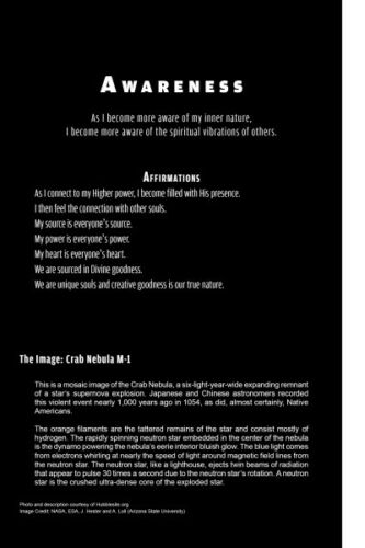 Sacred Space Meditation kortos remiasi filosofija, kad mes visi esame tos pačios vibracijos, nuolat augantys, visada kuriantys, ir Visatos energija teka per visus vienodai. Kosmoso meditacijos kortelės su 56 gražiais Hablo kosminio teleskopo vaizdais padeda pasisemti energijos, kad būtų galima pajusti vidinės ramybės, tylos ir gausos jėgą bei potencialą.