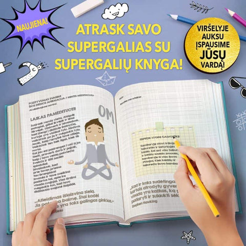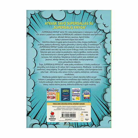 Rašymas apie save sustiprina pasakojimo, rašymo įgūdžius, neretai parodo, kaip konstruktyviai ir įdomiai galima išspręsti problemas ar sunkumus tiek namuose, tiek mokykloje. Rašydamas mokaisi pažinti save, atskleisti savo jausmus, atkreipi dėmesį į tai, kaip žodžiai, surašyti popieriuje, virsta patraukliomis idėjomis. Šioje SUPERGALIŲ KNYGOJE rasite puikių mindfulness ir kitokių meditacijos pavyzdžių, kurie įkvėps ne tik vaikus, bet ir suaugusiuosius. Meditacija – tai dėmesio sutelkimas į vieną objektą. Tai gali būti kvėpavimas, vaizdinys, tyliai kartojamas žodis arba frazė – afirmacija, arba ramus minčių ir pojūčių stebėjimas, vadinamas mindfulness. Meditacija padeda išgirsti savo norus ir atrasti stiprybės šaltinį savyje!