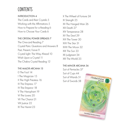 Daugelį amžių taro kortos ir kristalai buvo naudojami kaip galingi spėjimo būdai, o "The Crystal Power Tarot" juos sujungia. Visoje kaladėje yra daugiau nei trisdešimt nuostabių akmenų, o ant kiekvienos taro kortos pavaizduotas puošnus dailininko sukurtas taro paveikslas. Knygoje pateikiami visų kortų aiškinimai, jų kristalų savybės ir penkios išklotinės, kurias galima išbandyti - nuo paprastos dienos kortos iki septynių kortų čakrų išklotinės gydymui. Kiekvienoje kortelėje taip pat pateikiama įgalinimo afirmacija, kuri suteikia galimybę išreikšti savo ketinimą ir užmegzti ryšį su kortos kristalu, taip imantis veiksmų, kad paveiktumėte savo ateitį ir paverstumėte savo svajones realybe. Šis unikalus kristalų taro - nuo patarimų apie santykius iki karjeros gairių - nušviečia tai, kas jums dabar svarbu, ir suteikia priemonių, kaip įgyvendinti savo norus.